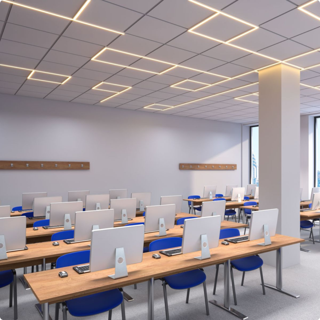 Well-planned educational false ceiling design enhances both functionality and aesthetics in learning environments. Professional institutional ceiling and lighting works focus on durability, safety, and optimal light distribution to support daily academic activities. Practical classroom false ceiling solutions improve visual comfort by reducing glare, concealing services, and maintaining a clean, organized look.