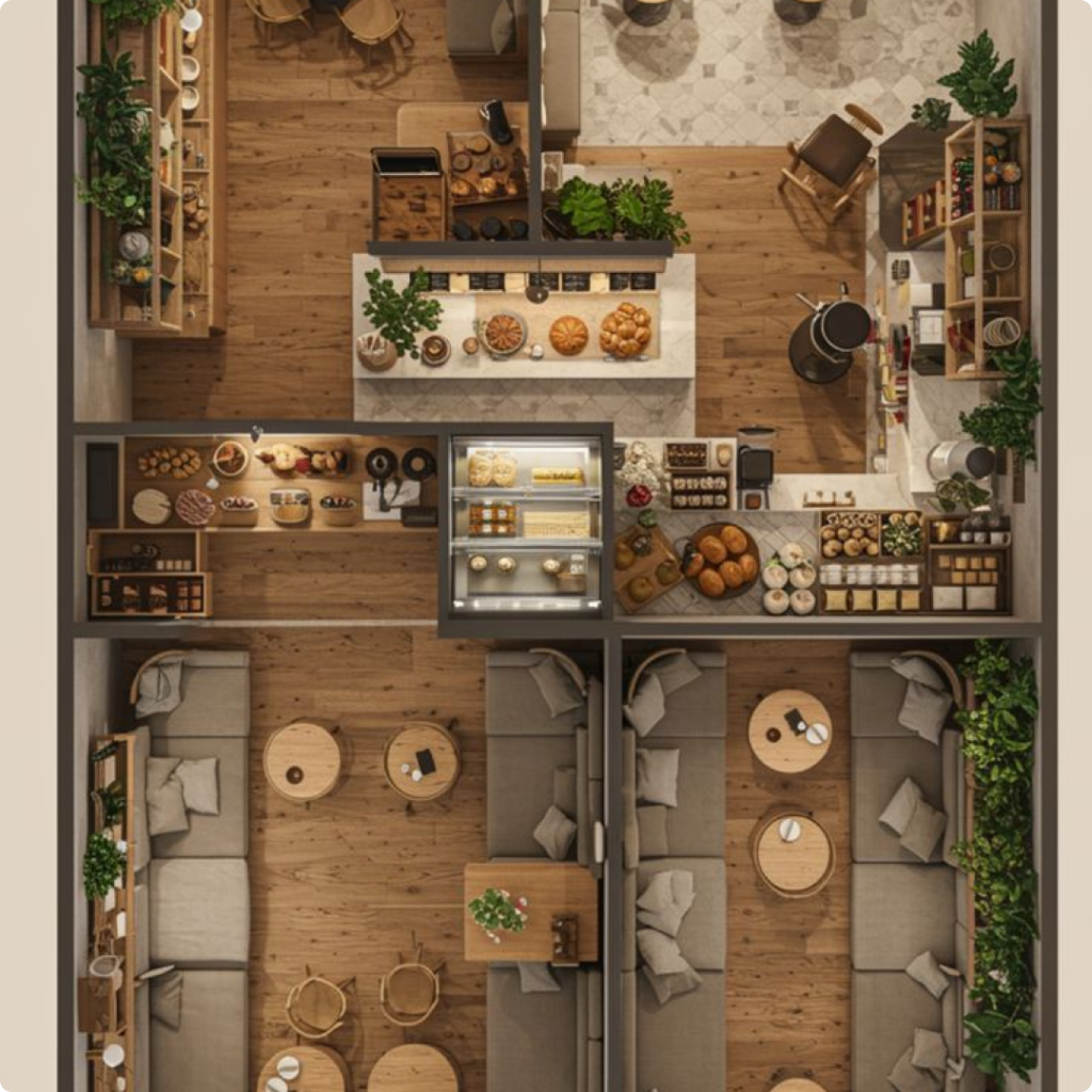 Our expert approach to cafe layout planning focuses on balancing ambience with functionality. From entrance flow and service counters to kitchen coordination and wash areas, every zone is carefully planned. Smart seating layout optimization helps increase table turnover while maintaining privacy and guest comfort, making the space both profitable and welcoming.