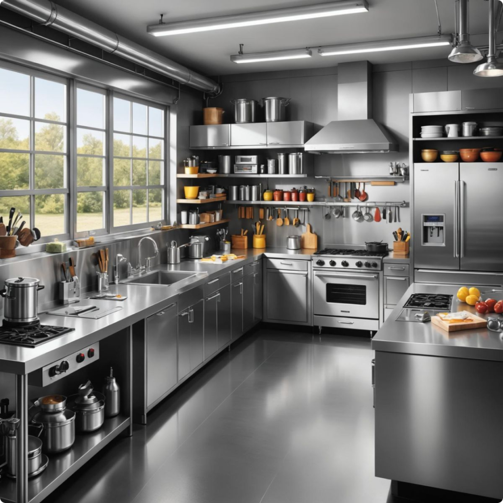 Modern cafe kitchen interior design balances compact layouts with functionality, ensuring optimal use of available space without compromising staff comfort. Smart commercial kitchen layout design considers equipment placement, ventilation, drainage, and safety regulations to create a seamless working environment.