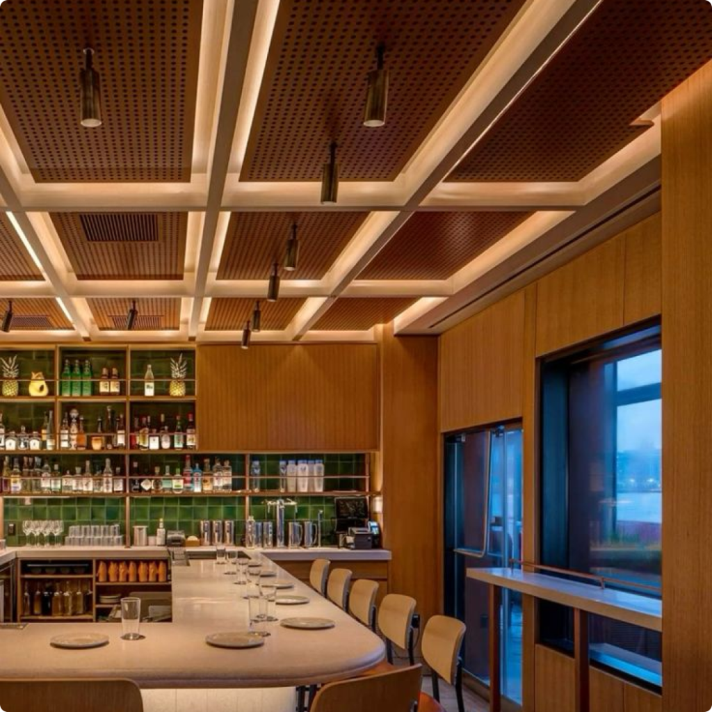 Advanced noise control for restaurants includes ceiling baffles, wall panels, and soft furnishing integration that reduces background noise without affecting design aesthetics. With the right acoustic treatment, restaurants and cafés achieve a pleasant sound environment that supports comfort, privacy, and longer customer stays—transforming noisy spaces into calm, enjoyable dining interiors.