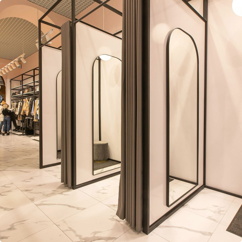 A dedicated showroom product demo area helps demonstrate features, functionality, and value clearly, making the shopping experience more informative. Stylish modern retail trial rooms integrate smart lighting, mirrors, and finishes that enhance comfort and visual appeal.